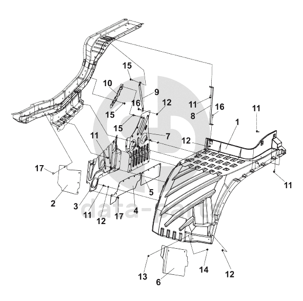 Задний левый продольный брызговик в сборе